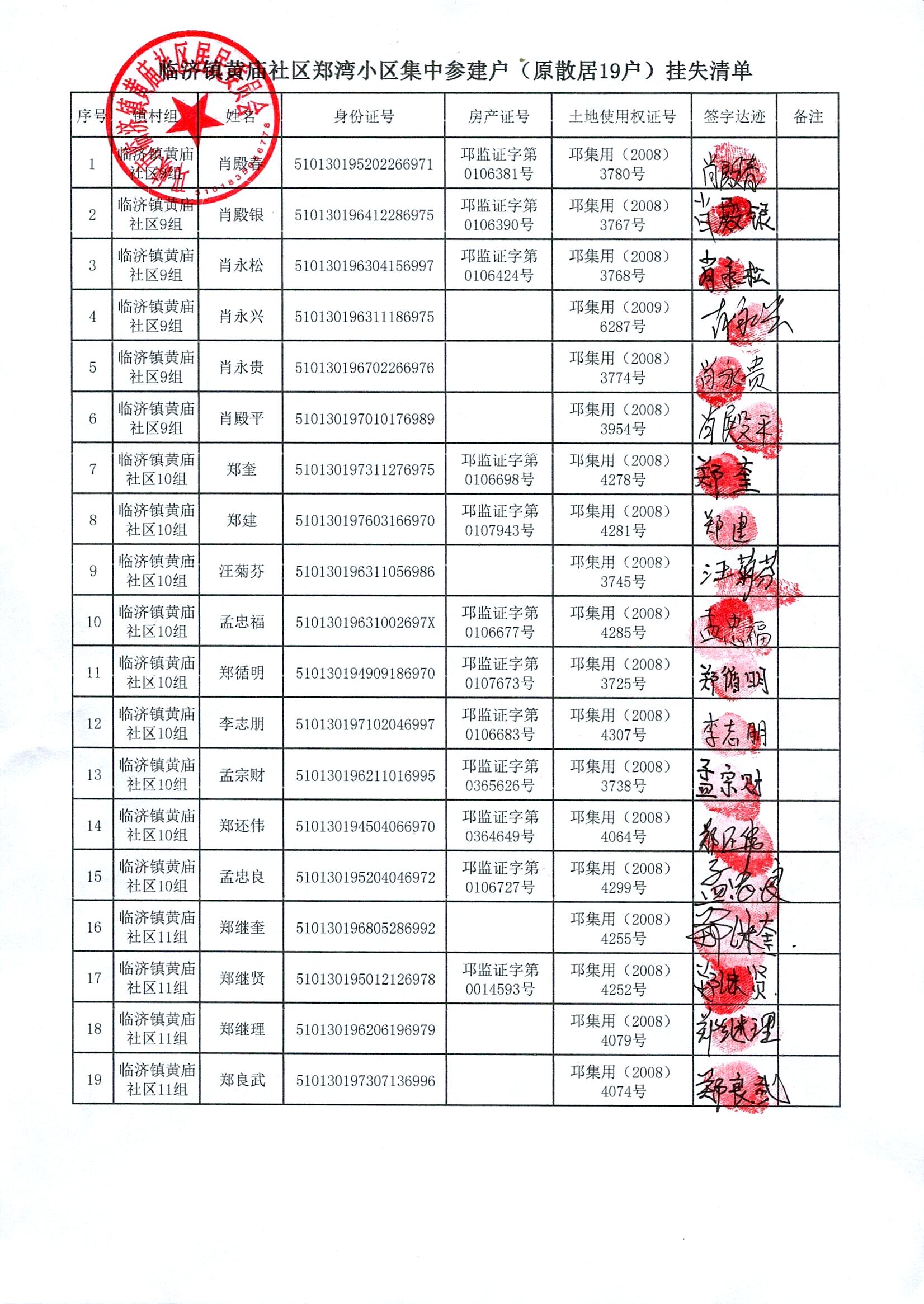 19 | 临济镇黄庙社区11组 | 郑良武 | 510130197307136996 | 邛集用(2008)4074号 |
