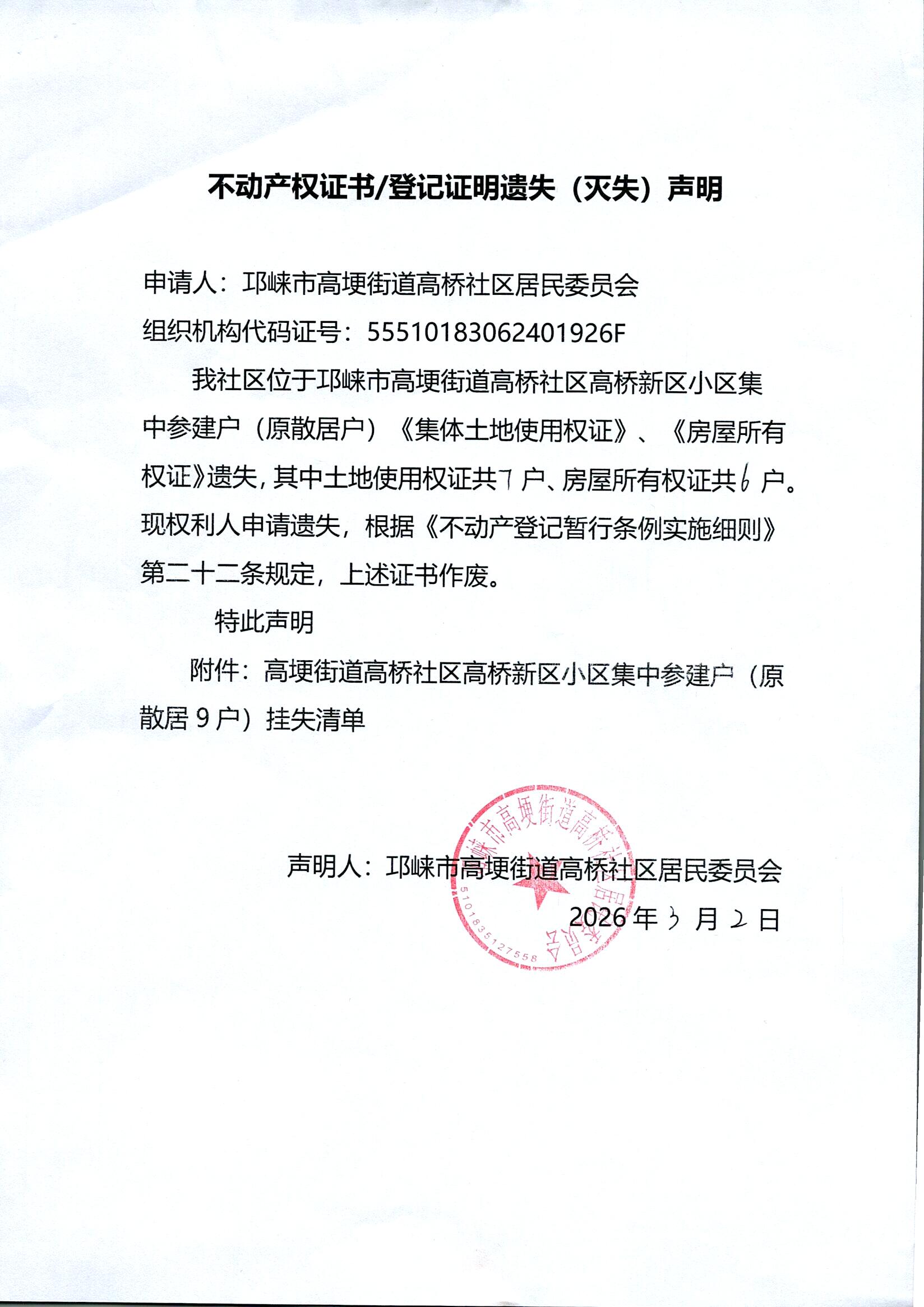 我社区位于邛崃市高埂街道高桥社区高桥新区小区集中参建户(原散居户)《集体土地使用权证》、《房屋所有权证》遗失,其中土地使用权证共 7 户、房屋所有权证共 6 户。现权利人申请遗失,根据《不动产登记暂行条例实施细则》第二十二条规定,上述证书作废。